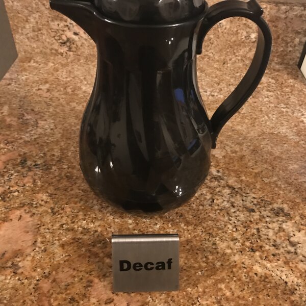 Beverage stations are popular on a breakfast or brunch buffet but can get confusing without clear labeling! This "decaf" sign is easy to read and good for coffee stations!!