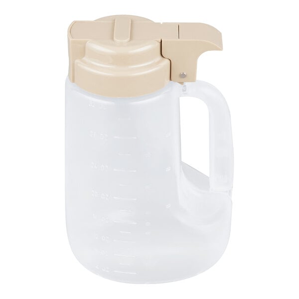 This TableCraft PP32BE Option 32 oz. dispenser is great for juices, dressings, batters, oils, mixes, and other similar products! It features graduations on the side in ounces and milliliters for accurate measuring and easy reference, plus a convenient handle for easy pouring.