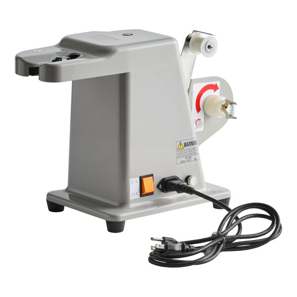 This device uses a straight line ribbon feed to prevent jamming. It consistently creates ultra-tight twist tie closures by using 4 full twists. Plus, it uses only a 3" piece of twist tie material per tie to reduce costs. This model works with Tach-It 03-2500, 01-2460, 17-2000, and 20-4000 twist tie ribbons (sold separately). It requires a 110V electrical connection for operation.