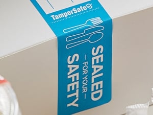 This paper tamper-evident label features perforations to make it clear to customers that their food has not been tampered with during transit.
