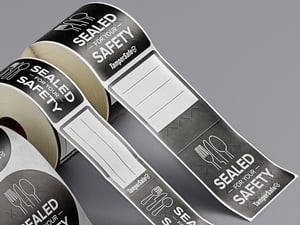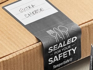 This paper tamper-evident label features perforations to make it clear to customers that their food has not been tampered with during transit.