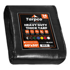Keep important items protected with this Tarpco Safety 40' x 50' black extra heavy-duty weatherproof 14 mil poly tarp with reinforced edges. This multi-purpose tarp serves as a protective cover for items such as building materials, vehicles, roofs, and outdoor furniture. It boasts metal grommets every 24" and it has reinforced edges, making it quick and easy to tie down. Thanks to the ultra-strong grommets, your tarp will remain securely in place even when it is windy.