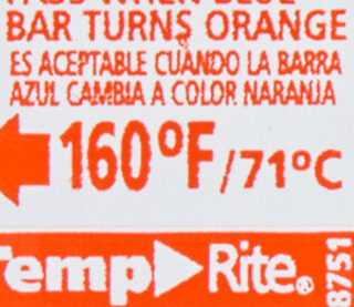The temperature measurement is visible by the thermocromatic color-change band on the label. When the wash cycle reaches 160 degrees Fahrenheit, the band changes colors from blue to orange. The label measures temperatures within +/- 2 degrees Fahrenheit.