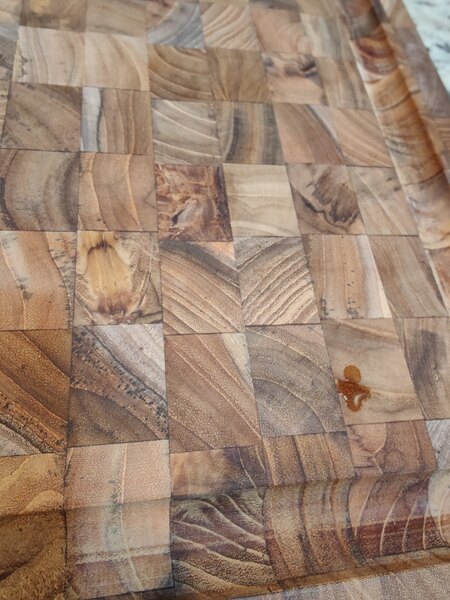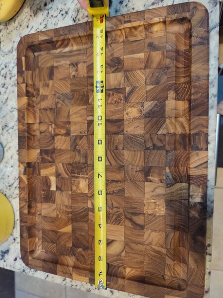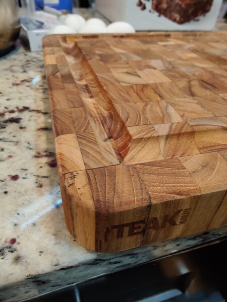 I bought this cutting board (in the required pack of 2) based on recommendations from review sites like America's Test Kitchen, but the board is not of the quality I had hoped for: 1. The butcher block measures 16x12, not 17x12, and with wide juice grooves the useable area is only 13x9. 2. Many sections are rough, in need of more sanding. 3. Many wood pieces are discolored gray or black 4. Some wood pieces have black spots 5. Wood pieces are misaligned. This is not a brand that can be ordered online, product unseen. In the future, I would consider Teakhaus only if I bought in person and could inspect for issues before purchase. More likely I would select another brand altogether.