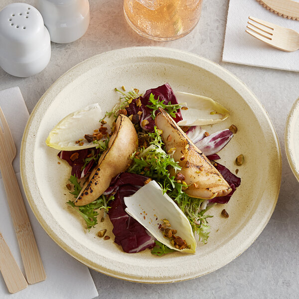 If you're looking for the convenience of disposable products without the environmental impact of plastic or foam, look no further than the Tellus Products 9" no PFAS added compostable fiber plate. Perfect for both hot and cold foods, this plate is an ideal solution for restaurants, caterers, and sandwich shops that serve anything from hot slices of pizza to cold salads to go.