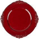 An excellent accent to both table settings and dishes, this Charge It by Jay! 1182056 13" royal red plastic charger plate is colored a deep, satin scarlet and decorated with fine rim embossing fit for a king. This charger plate is great for adding elegance to your most popular foods, and it accents your dinnerware with a regal sophistication. It's ideal for wedding receptions, anniversary parties, and other catered celebrations where you want to make customers feel like they just walked off the red carpet.