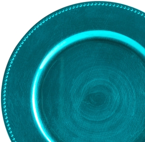 With a classic, beaded rim, slightly worn edging, and bold, aqua color, this charger plate will further accent your table setting. Made of durable polypropylene, this charger plate is strong and can withstand daily wear and tear.