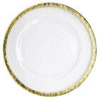 Dress up your dining room table with this Charge It by Jay! 1470401 12 5/8" hammered ice gold band charger plate! Boasting an elegant, gold hammered rim, this charger plate is great for enhancing food presentations at your restaurant, catered event, or outdoor reception. Its ample 12 5/8" diameter provides plenty of room for resting under your soup bowls, salad plates, and entree platters.