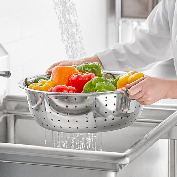 Enhance your kitchen with this Thunder Group 12 qt. stainless steel coarse Chinese colander! With a durable stainless steel construction, this colander is sure to withstand the rigors of your kitchen. It has a rust-resistant, long-lasting design that is perfect for coming into frequent contact with water while you cook. Plus, its 4.5 mm holes are the perfect size for draining water while still retaining food.
