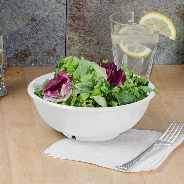 Modern, sleek, and stylish, this Thunder Group CR5807W white 32 oz. melamine salad bowl provides the perfect backdrop for serving your patrons' favorite foods! While its sophisticated design and classic white color combine to create a stunning display that is sure to enhance the appearance of any offering, its elegant, rolled edge supplies a subtle border for added aesthetic appeal. Featuring a durable melamine construction, this versatile bowl is also built to withstand the wear and tear of everyday use, helping you serve your specialty salads, soups, and entrees time after time!