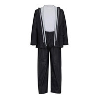 The jacket features a storm-fly front with a snap button closure, and it has modified raglan sleeves with a 90-degree sleeve-to-body angle. The hood has snaps to attach to the jacket, so it can easily be removed, and it also has a drawcord. The overalls feature a plain front and elastic suspenders with black plastic attachment clips. Perfect for staying dry in inclement weather, this rainsuit is ideal for use in agriculture, construction, utilities, and landscaping.