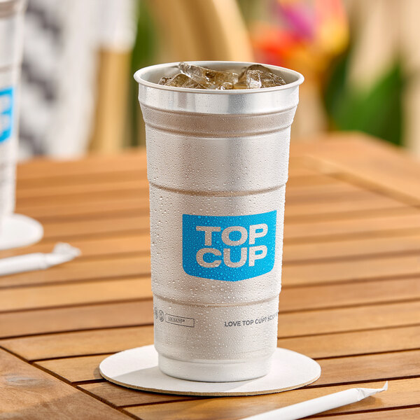 This Top Cup by Ball 12 oz. aluminum cup is great for serving water, soda, or any other beverage on the go. It offers a simple, sleek design with a blue Top Cup logo. Plus, its durable yet light weight construction and convenient design make it a must-have for your busy establishment.