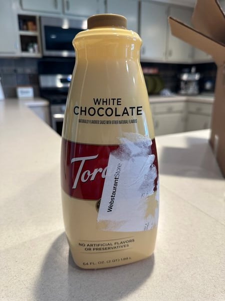 Perfect white chocolate sauce by Torani. It melts beautifully in hot drinks and it's a customer favorite.