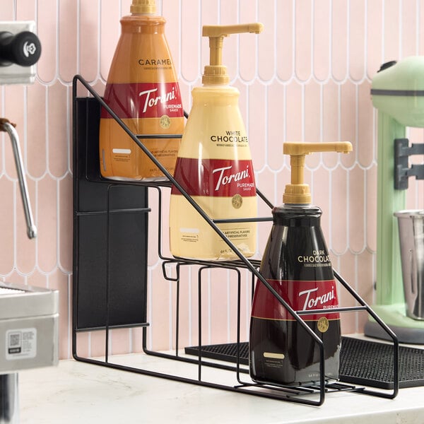 Showcase an assortment of flavoring sauces with this Torani 3-tier wire rack for flavoring sauce bottles! This slim, durable rack is made with a black powder-coated steel wire frame that optimizes valuable counter space. It features 3 tiers for organizing and displaying flavoring sauces. This item is compatible with 64 oz. Torani flavoring sauce bottles.