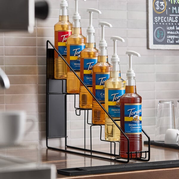 Showcase an assortment of flavoring syrups with this Torani 6-tier wire rack for flavoring syrup bottles! This slim, durable rack is made with a black powder-coated steel wire frame that optimizes valuable counter space. It features 6 tiers for organizing and displaying flavoring syrups. This item is compatible with 750 mL-1 liter Torani syrup bottles.
