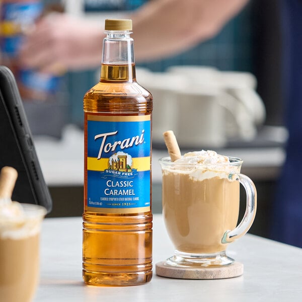 Bring all new flavors to your specialty drink menu with this Torani sugar-free classic caramel flavoring syrup! It's sweetened with a sugar-free sweetener, which offers the taste of real sugar without the calories. This tempting flavor will complement your beverages without overpowering them or being too sweet, while the user-friendly bottle will be convenient for your busy baristas to use. The syrup is packaged in a convenient plastic bottle which prevents broken glass in the prep area, and it can easily be paired with a compatible pump (sold separately) for quick, efficient service during peak serving hours. This dairy-friendly Torani flavoring syrup is specially formulated to resist curdling in milk and to hold up well under heat, making it the perfect choice for espresso-based drinks, brewed coffee, or tea.