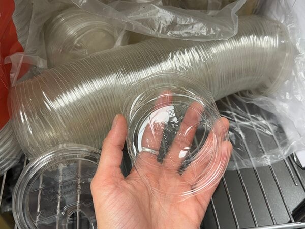 This lid works great when it fits, but unfortunately more than half of the box was unusable by the time it was delivered. They warp very easily in heat, making most of what we ordered unable to be applied.
