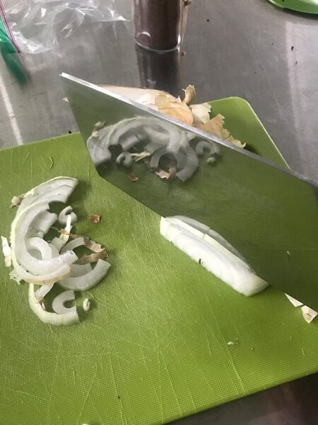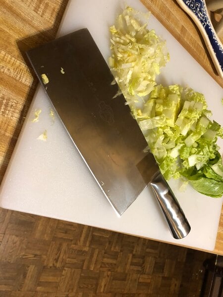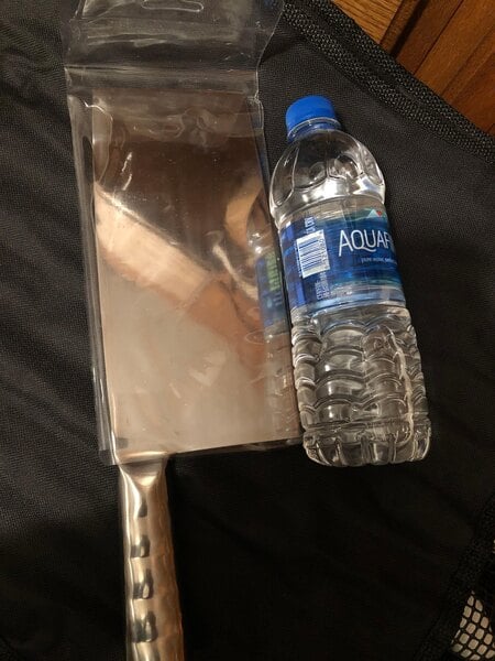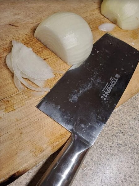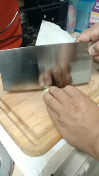 Solid and sturdy is metal handle that is part of the blade. Decently sharp but not enough to blow your mind. Will definitely cleave as needed though I was suprised to read on the label that is is not intended for cutting bone. So if you need a cleaver that can handle tougher bone cutting tasks keep that in mind.