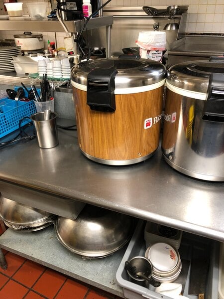 Great rice warmer. Keeps rice warm and doesn't dry out. Made in Taiwan. It did come with a dent on the lid so Webstaurantstore gave us a small credit.
