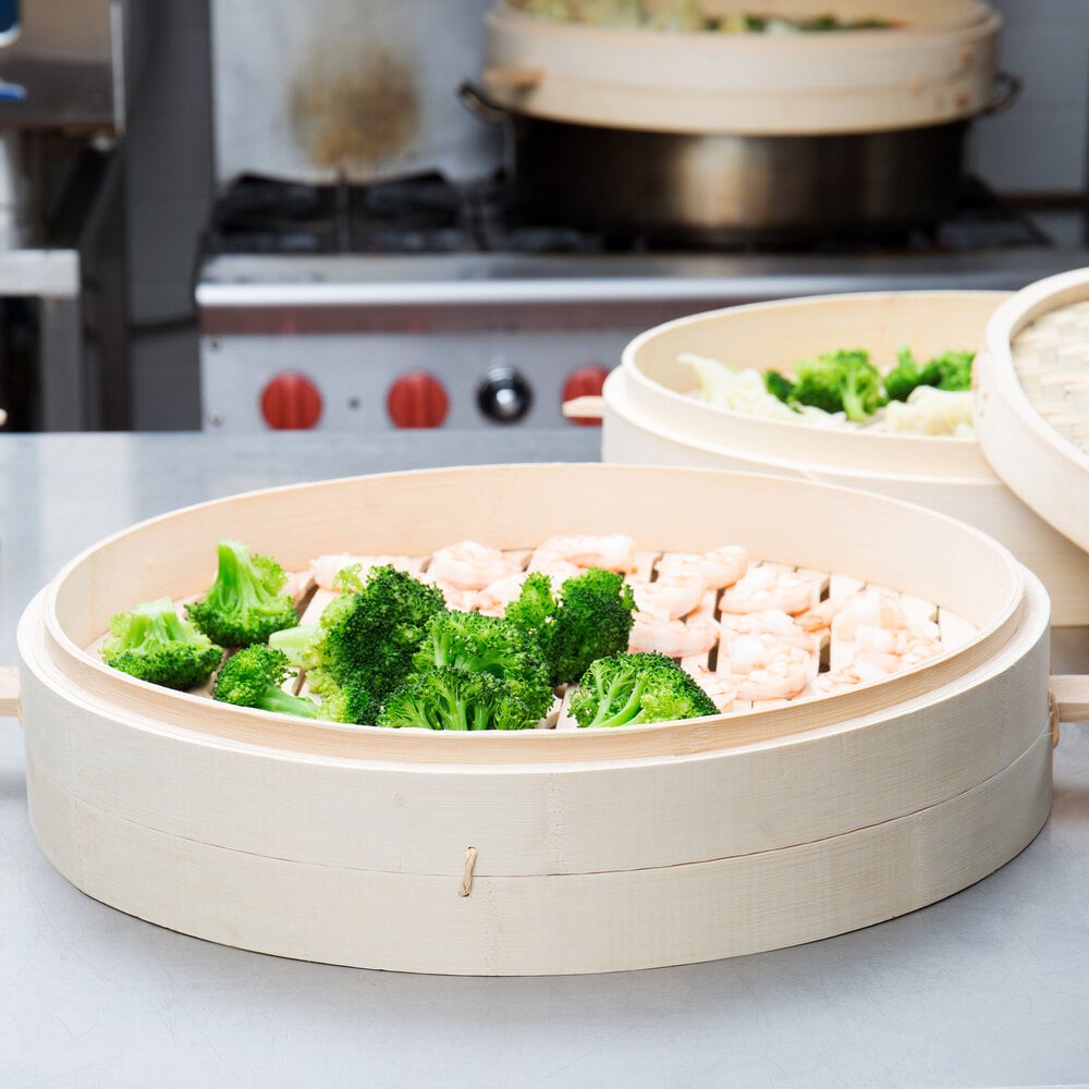 This set is crafted from 100% commercial-grade, white bamboo and contains no metal in its construction. Unlike metal steamers, bamboo is an extremely effective steaming material due to its ability to absorb condensation. Its body features neatly fitted bottom slats, which along with its tightly hand-woven lid, ensures your foods are properly steamed for optimal flavor. Plus, being made with only sustainable materials, this steamer set offers a great option for your vegan or eco-conscious business!