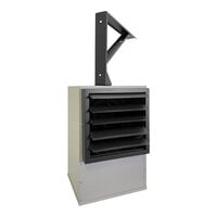 This unit comes with a hanger bracket for easy mounting on the wall or ceiling. It mounts in a vertical position only with the motor shaft in the horizontal position or in a 45-degree downward position. It also has pre-drilled holes and installed threaded nuts for hanging by 1/4" threaded rods. This heater has a control compartment with a hinged, latched access door for simple wiring installation and maintenance. It comes complete with a built-in contactor to control the flow of electricity. It requires a 240V, 1-3 phase electrical connection for operation.