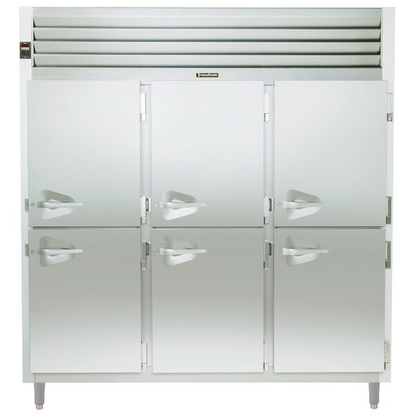 Thanks to its high performance ducted fan air distribution system, this Traulsen Specification Line AHF332WP-HHS 83.2 cu. ft. three section half door reach-in pass-through heated holding cabinet delivers even heat distribution, quicker daily start-up, lower energy use, and reduced lifetime service costs when compared to a standard model. The pass-through design allows it to be conveniently placed between your kitchen and serving or prep area so your staff can load prepared items from the back and your servers can access them from the front.