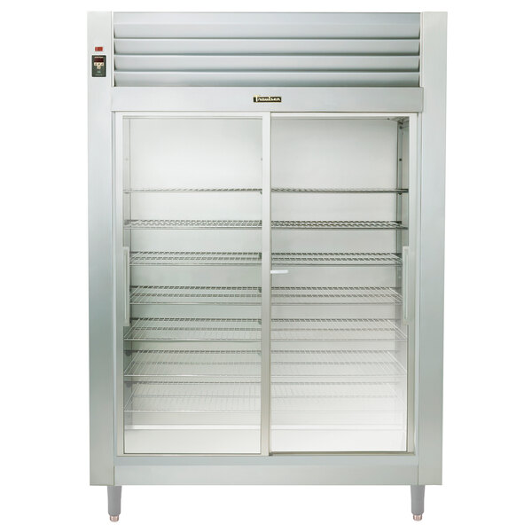The Traulsen Specification Line RHT232NUT-FSL all stainless steel 46 cu. ft. two section narrow sliding glass door reach in refrigerator is designed to prevent the blocking of aisles in kitchens with limited space! The self-closing sliding glass doors offer a crystal clear view of the refrigerator's contents, and for convenience they come with a stay-open feature when fully opened.