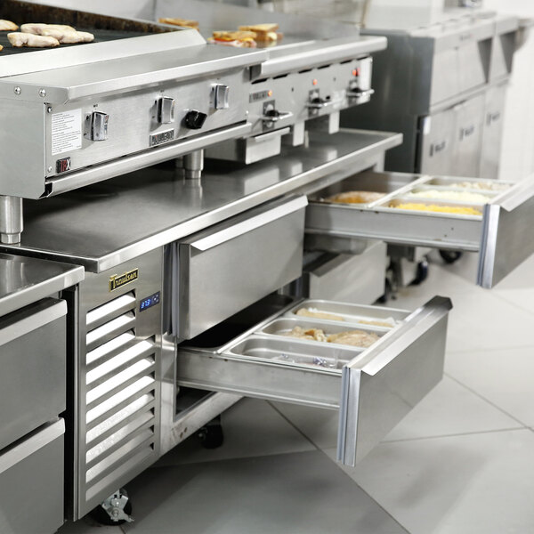 The Traulsen Specification Line TE072HT four drawer 72" refrigerated chef base makes food preparation faster and more convenient by providing both a cooled storage area for ingredients and a sturdy base to support your cooking equipment! Each drawer can hold two 12" x 20" full size pans up to 6" deep (sold separately). For added convenience, the drawers come with self-closing and stay-open features.