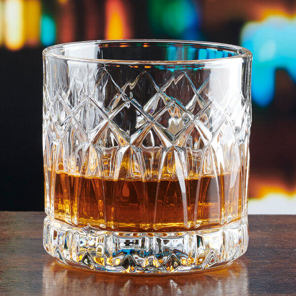 If you are looking for a cool, classy glass, add this Traze PST 11.75 oz. rocks / old fashioned glass to your shelves. Its sleek form is perfect for busy, urban restaurants, bars, and clubs. Traze glasses are not solely for drinking; they can also be viewed as art. Each old fashioned glass represents a direction or period in time. The PST glass's ornate, traditional design takes inspiration from classical art from the past. Plus, it has been cut from high-quality soda lime glassware for durability and resilience. Its dense glass construction can withstand heavy-handed use. This rocks glass will last you a long time, pleasing countless customers along the way!