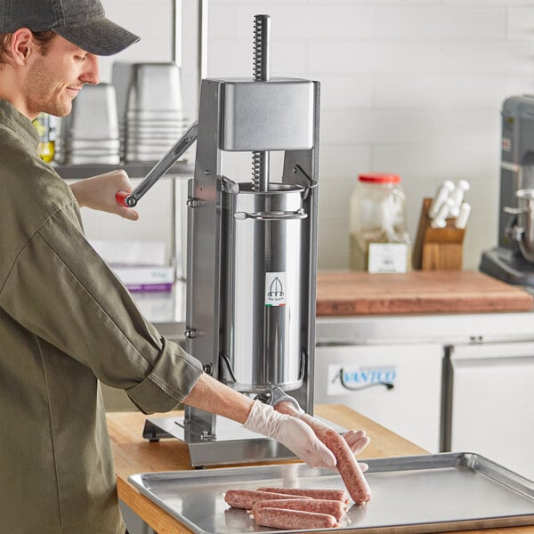 Easily turn your signature ground sausage into delectable links with this Tre Spade manual vertical sausage stuffer!