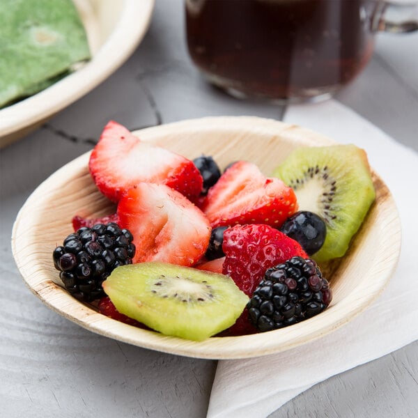 A great alternative to paper, plastic, or foam bowls, this EcoChoice palm leaf bowl is a stylish way to serve fruit, salsa, side dishes, small salads, appetizers, and much more! Convenient and environmentally-friendly, this bowl is the perfect addition to catered events, cafes, and cafeterias.