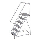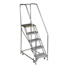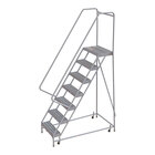 Equip your large commercial space or industrial facility with this Tri-Arc rolling safety ladder! Light weight yet durable, this ladder's aluminum frame makes it ideal for use in applications where portability is a must. The frame boasts 1 1/16" OD tubing and has a weight capacity of 450 lb. Its sleek mill finish and resistance to corrosion provide added resilience in environments where moisture or chemicals are present. The 36" high handrails and 56-degree climbing slope facilitate a safe ascent, and the foot pedal lockstep allows you to use your foot to park the ladder before ascending.