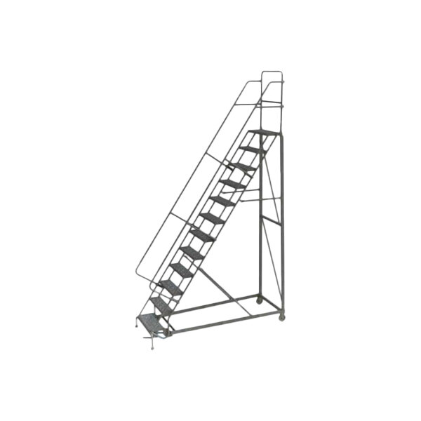 Equip your large commercial space or industrial facility with this Tri-Arc heavy-duty rolling safety ladder! Providing the ultimate safety and durability even in demanding environments, this ladder's heavy-duty steel frame boasts rugged 1 1/16" tubing and reinforced bracing, and it has a weight capacity of 600 lb. The frame is finished with a sleek gray powder coating to ensure a resilient, long-lasting surface that is highly resistant to scratching, water and chemical corrosion, and weathering. The 36" high handrails and 56-degree climbing slope facilitate a safe ascent, and the step lock inhibits ladder movement when in use.