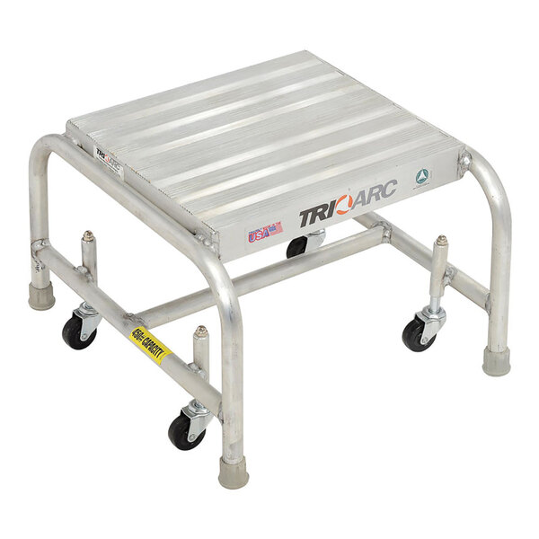 This Tri-Arc mobile step stool is the perfect vertical access solution for your warehouse or facility! Light weight yet durable, this stool's aluminum frame makes it ideal for use in applications where portability is a must. The frame boasts 1 1/16" OD tubing and has a weight capacity of 350 lb. Its sleek mill finish and resistance to corrosion provide added resilience in environments where moisture or chemicals are present. The 56-degree climbing slope facilitates a safe ascent.