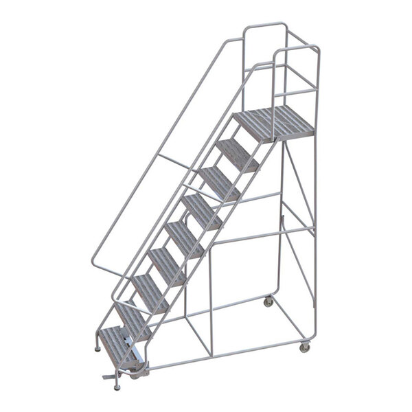 Equip your large commercial space or industrial facility with this Tri-Arc rolling safety ladder! Light weight yet durable, this ladder's aluminum frame makes it ideal for use in applications where portability is a must. The frame boasts 1 1/16" OD tubing and has a weight capacity of 450 lb. Its sleek mill finish and resistance to corrosion provide added resilience in environments where moisture or chemicals are present. The 36" high handrails and 56-degree climbing slope facilitate a safe ascent, and the foot pedal lockstep allows you to use your foot to park the ladder before ascending.