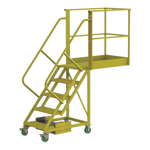 This ladder's mobile design with 4 casters allows users to effortlessly transport it wherever they need it to go, while the 42" high handrails provide continuous holding points along the entire stretch of the climb. For added safety, the ladder's (5) 24" wide steps and top platform have a perforated tread that allows water to pass through and provides traction to ensure safety. The spacious top platform has a 40" overhang that provides plenty of room and a stable work surface great for accessing any hard-to-reach areas where a conventional safety ladder won't do the trick. This ladder ships unassembled and meets OSHA 1910.29 and ANSI A14.7 standards.