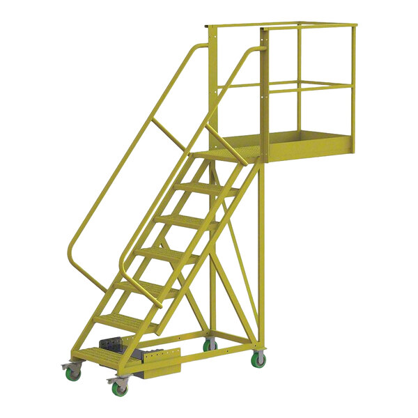 This ladder's mobile design with 4 casters allows users to effortlessly transport it wherever they need it to go, while the 42" high handrails provide continuous holding points along the entire stretch of the climb. For added safety, the ladder's (7) 24" wide steps and top platform have a serrated tread that's ideal for severe wet and slippery conditions and provides the ultimate in slip resistance and self-cleaning. The spacious top platform has a 40" overhang that provides plenty of room and a stable work surface great for accessing any hard-to-reach areas where a conventional safety ladder won't do the trick. This ladder ships unassembled and meets OSHA 1910.29 and ANSI A14.7 standards.