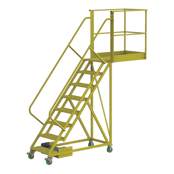 This ladder's mobile design with 4 casters allows users to effortlessly transport it wherever they need it to go, while the 42" high handrails provide continuous holding points along the entire stretch of the climb. For added safety, the ladder's (8) 24" wide steps and top platform have a serrated tread that's ideal for severe wet and slippery conditions and provides the ultimate in slip resistance and self-cleaning. The spacious top platform has a 40" overhang that provides plenty of room and a stable work surface great for accessing any hard-to-reach areas where a conventional safety ladder won't do the trick. This ladder ships unassembled and meets OSHA 1910.29 and ANSI A14.7 standards.