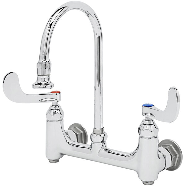 T&S B-0352-04 Wall Mounted Surgical Sink Faucet with 8" Adjustable Centers, 5 1/2" Rigid Gooseneck, Built In Stops, and 4" Wrist Action Handles