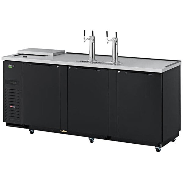 Looking to serve the coldest beer around? Supply your bar with this Turbo Air Super Deluxe TCB-4SBD-N black beer dispenser with club top and double taps! Featuring 2 tap towers with 2 faucets each, this dispenser makes it easy to serve your patrons cold, refreshing, perfectly drafted beer. This unit is designed to hold (4) 1/2 size barrels.