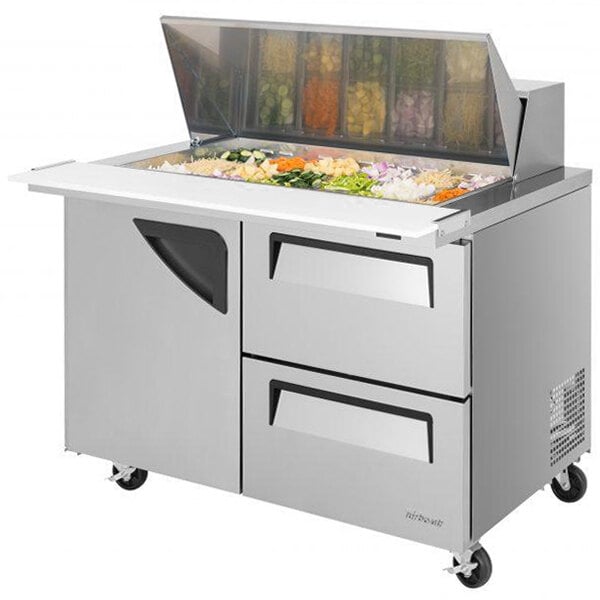 Easily assemble fresh, crisp salads and sandwiches with this Turbo Air Super Deluxe TST-48SD-18-D2-N 48" 1 door 2 drawer refrigerated mega top sandwich prep table! This heavy-duty unit boasts a stainless steel exterior with a galvanized back and bottom for long-lasting use that ensures streamlined service in your busy establishment. The top rail has an insulated solid lid and holds up to (18) 1/6 size food pans, 4" deep, with a full set of pans to get you started. Plus, it also includes a 9 1/2" deep, 1/2" thick high-density polyethylene cutting board as a space to prep orders and slice ingredients.