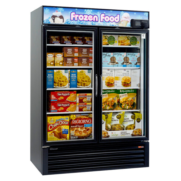 Easily keep your most popular frozen treats organized, cold, and ready for sale with the Turbo Air TGF-49FB-N black 54" glass door merchandising freezer! This merchandising freezer features 39.88 cu. ft. of storage space with 8 adjustable shelves so you can stock up on popsicles, ice cream, frozen yogurt, and other frozen foods while encouraging impulse sales thanks to the shadow-free, top-mount LGP ad panel and bright LED interior lighting.