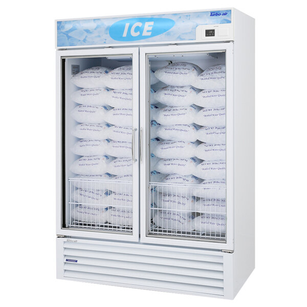 Eliminate ice melting issues with this Turbo Air TGIM-49W-N 55" white glass door ice merchandizer! Featuring two triple pane glass doors, this merchandiser is designed to retain its temperature while effectively merchandising bags of ice for sale. Plus, unlike other ice freezers that use refrigeration systems, this Turbo Air unit uses a freezer system to keep ice from melting even in hot ambient conditions!