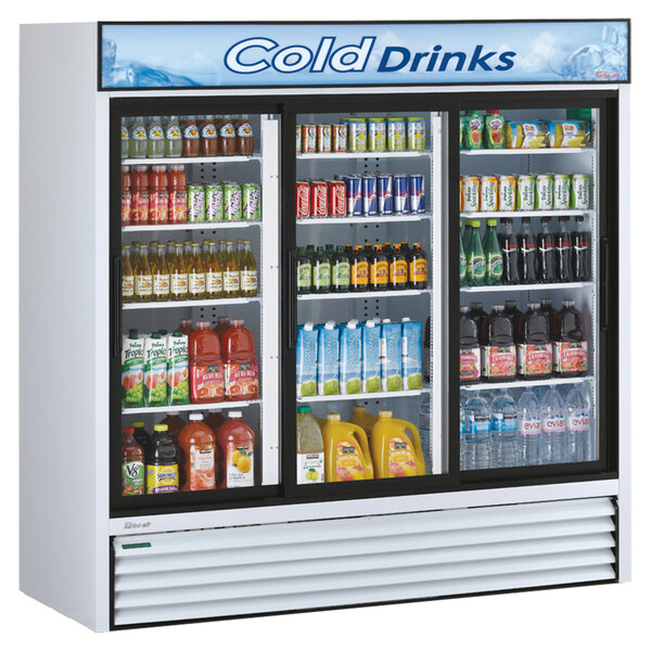 Keep your most popular beverages, foods, and other refrigerated items cold and ready for sale with this Turbo Air TGM-69R-N 78" white three section sliding glass door merchandising refrigerator. It features 69 cu. ft. of space and 12 shelves, so you can stock up on your most popular refrigerated products while encouraging impulse sales. And thanks to its LED advertising panel this merchandiser allows items to stand out and catch customers' eyes. Interior LED lighting puts all the attention on your product and illuminates it for better visibility. Plus, the double pane glass doors are made with Low-E glass for better efficiency.
