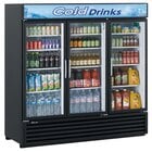 Keep your most popular beverages, foods, and other refrigerated items cold and ready for sale with this Turbo Air TGM-72RSB-N 78" black three section glass door merchandising refrigerator. It features 72 cu. ft. of space and 12 shelves, so you can stock up on your most popular refrigerated products while encouraging impulse sales. And thanks to its LED advertising panel this merchandiser allows items to stand out and catch customers' eyes. Interior LED lighting puts all the attention on your product and illuminates it for better visibility. Plus, the double pane glass doors are made with Low-E glass for better efficiency.
