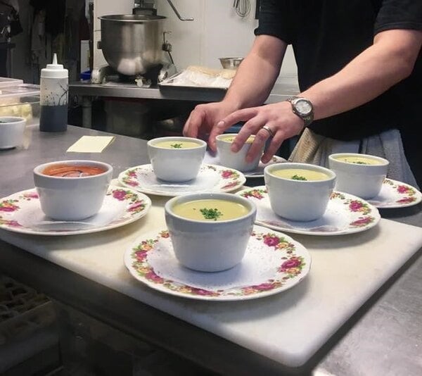 We serve soups and dessert in this bright white bouillon style cup! It works beautifully for a chilled layered mousse or hot rice pudding!!! Obviously good for consume or clear soups!!