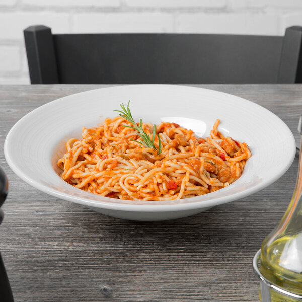 Featuring exquisite, embossed lines, this collection is reminiscent of rippling tides and coastal sandbars, to create a look that is natural and graceful. With its sophisticated styling, this bowl will ensure your shareable pastas will look as great as they taste. Plus, the clean, professional porcelain white coloring will create contrast to enhance the presentation of your signature menu items.