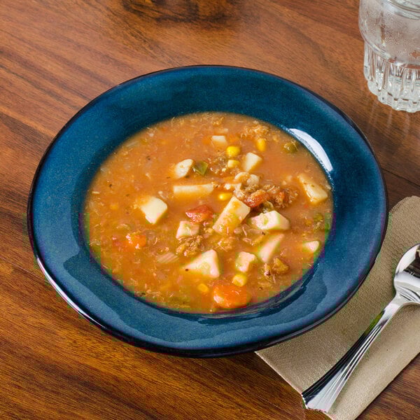 Vibrant color and an original rustic style sum up the Tuxton GAN-062 TuxTrendz Artisan Night Sky 9.5 oz. rim china soup bowl.