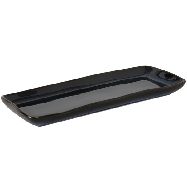 Vibrant color and an original rustic style sum up the Tuxton GAN-551 TuxTrendz Artisan Night Sky 13 3/4" x 5" china tray. This tray may be used in combination with other size and color choices in the TuxTrendz Artisan line to create the perfect way to serve appetizers, samplers, or desserts at your restaurant, cafe, pub, or lounge.