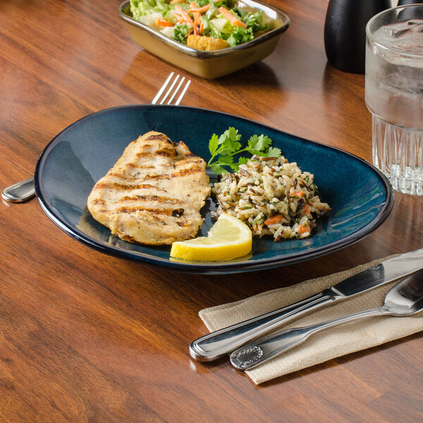 This ellipse plate may be used in combination with other size and color choices in the TuxTrendz Artisan line to create the perfect place setting at your restaurant, cafe, pub, or lounge. Durable and resistant to wear, this dish offers a creative backdrop to whatever foods you wish to serve. The rich, blue palette paired with the natural edge gives a hand-thrown appearance to enhance the rustic look. Whether needed at a diner, restaurant, or high-end bar, the Night Sky line is the perfect, eye-catching choice.